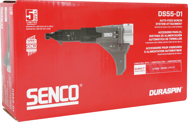 DS55 priedas yra varžtų tvirtinimo priedas, kuris tinka įvairiems šiuo metu naudojamiems atsuktuvams. DuraSpin technologija įdiegta į įrankį, kurį jau turite ir kuriuo pasitikite. Naujieji DuraSpin automatinio tiekimo antgaliai paverčia standartinį atsuktuvą sujungtų varžtų sistema. Nereikia pirkti viso naujo įrankio, šis DuraSpin priedas tinka įvairiems atsuktuvams (patikrinkite, ar jis tinka jūsų įrankiui, naudodamiesi informacija apie konkretų gaminį*). Šis priedas padeda naudotojui sutaupyti pinigų ir kartu užtikrinti didelį DuraSpin efektyvumą. Galima įsukti 3,5-5,5 mm skersmens 25-55 mm ilgio varžtus. Idealiai tinka daugeliui medžio ir (arba) metalo darbų. *DeWalt: DW268, DW269, DW275.